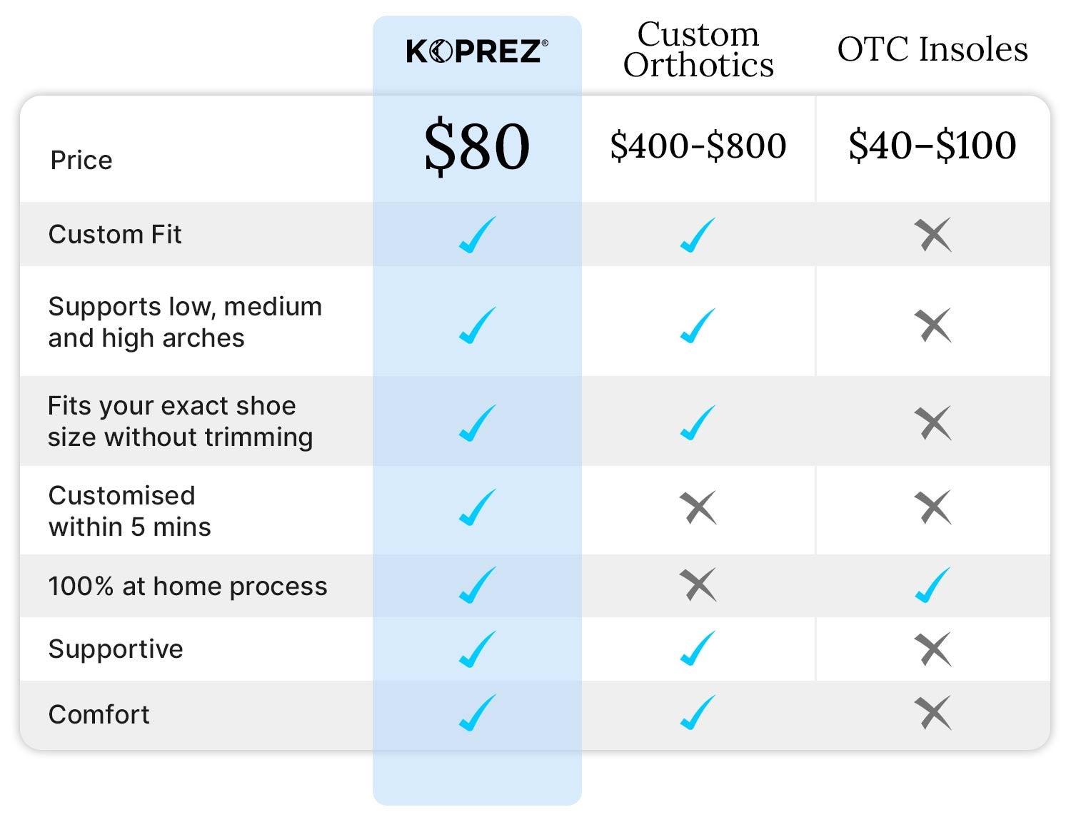 OTC insoles may be affordable but they’re mass-produced to fit everyone. Made in generic S, M, and L sizes and trimmed to your shoes, they never truly fit you. Koprez Insoles combine the affordability of OTC insoles with the custom support of orthotics, delivering orthotic-level relief without the orthotic price tag — completely risk-free to try.